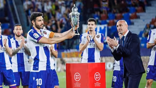 Así, en los prolegómenos del encuentro, el presidente de la RFEF, Luis Rubiales, entregó en el césped del Ciudad de Valencia el trofeo a Vicente Iborra, capitán del Levante, y los jugadores del cuadro azulgrana, esta vez de azul y blanco, con el presidente Quico Catalán, festejaron entre los aplausos y la ovación de las gradas.