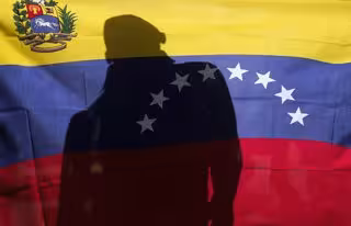 Archivo - Un hombre detrás de una bandera de Venezuela.