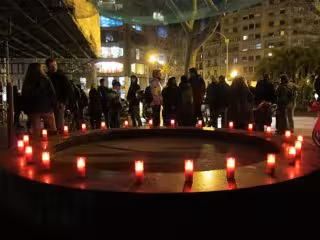 Un círculo formado por velas rojas y una pancarta en catalán con el lema '¡Viva la revolución bolivariana! El pueblo es Chávez, Chávez es el pueblo' ha formado parte de la concentración, en la plaza Urquinaona, a la misma hora en que por las calles de Caracas desfilaba el féretro de Chávez, fallecido a los 58 años a consecuencia de un cáncer.